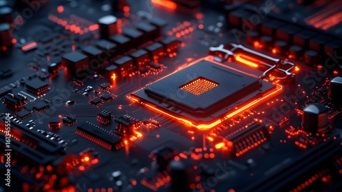 An intricate close up reveals a modern CPU microchip with glowing red illumination showcasing advanced technology and complex circuitry on a dark surface.