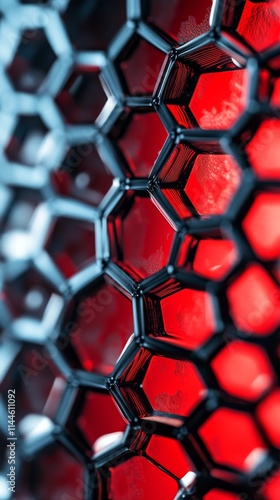 An intricate close-up of a honeycomb structure with metallic black and radiant red highlights. Ideal for backgrounds, designs, or tech-themed projects.. AI Generation. AI Generation