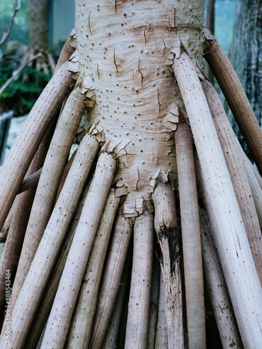 An intricate display of the unique root system of the Pandanus utilius, showcasing a textured bark and sturdy stilt roots.