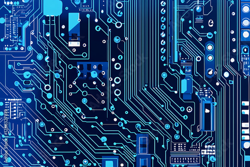 An intricate vector illustration of a blue circuit board with futuristic digital tech elements.