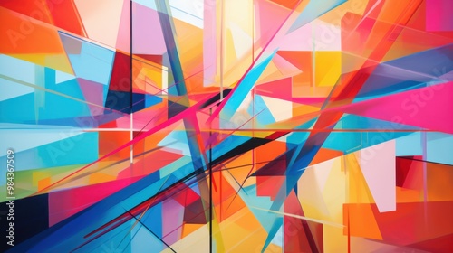 An intricate, vivid array of geometric shapes in bright colors creates a lively and dynamic visual display.