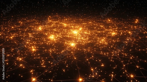 An intricate web of glowing dots and interconnected lines forming a futuristic network on a dark background.
