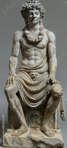 An intricately carved ancient seated man statue, showcasing intricate body details and flowing drapery folds.