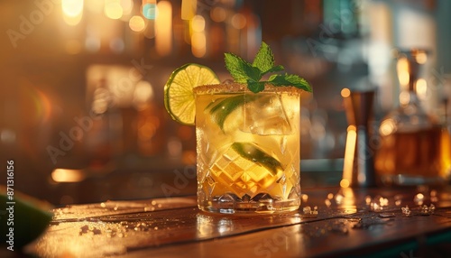 An intricately designed cocktail with a slice of lime and a sprig of mint