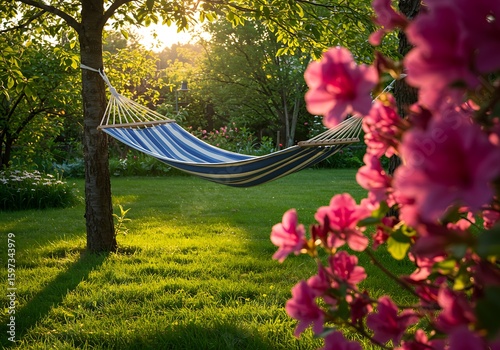 An inviting blue and white hammock offers relaxation in a tranquil, sun-kissed garden.
