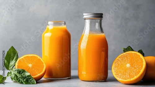 An inviting scene of freshly squeezed orange juice in elegant bottles displayed alongside whole oranges, showcasing vibrant colors and the essence of summer’s bounty.