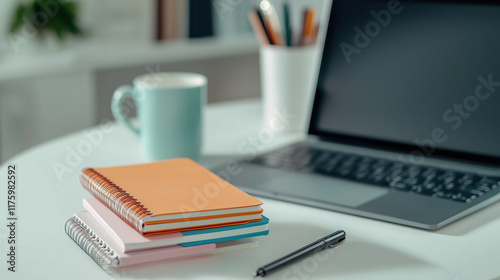 An inviting study space with stacked colorful notebooks on a white desk, pens placed neatly beside a laptop and a cup of tea.