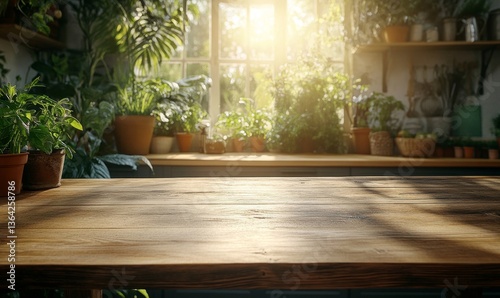 an inviting sunlit greenhouse interior with a rustic wooden table. The table is positioned in front of a window, framed by various potted plants and lush greenery