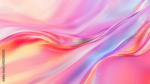 An iridescent fluid abstract image with vibrant colors in a smooth, flowing style on a soft gradient background. Vibrant holographic fluid colors flow abstractly. Abstract iridescent wave, pastel pink