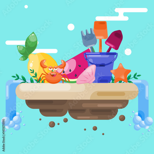 an island with a crab, a stream and summer fruits, a set of buckets and shovels for playing in the sand