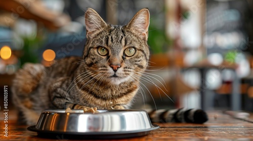 An Isolated, Beautiful Tabby Cat Is Joyfully Sitting Next To A Food Bowl On The Floor, Savoring Each Bite