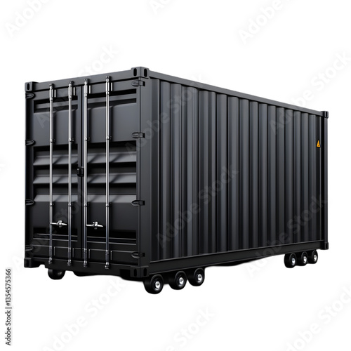 An isolated black shipping container on wheels, designed for secure storage and transportation of goods across land and sea.