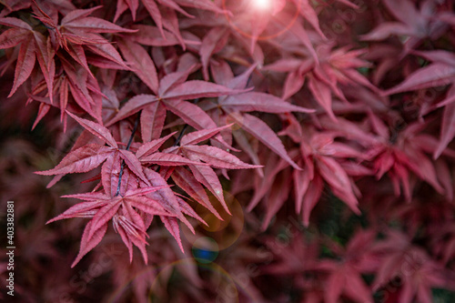 An isolated, close up eye level view of vibrant deep red Japanese Maple leaves with a sunburst peaking through