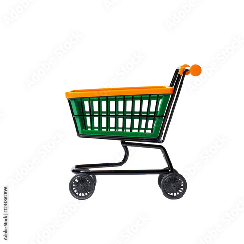 An isolated image showcases a small green and orange shopping cart against a black backdrop.