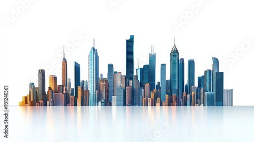 An isolated skyline of a modern city with tall buildings reflecting on a white surface.