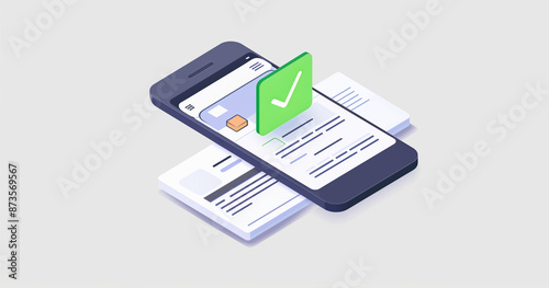 An isometric illustration showing a phone showing a successful payment for bitcoin. There is a green check mark on top of the phone. The background should be a simple light gray to emphasize