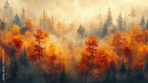 an isometric satellite image of an autumn forest glen watercolor mist and dappled sunlight styl