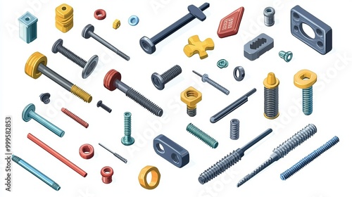 An isometric vector illustration set of nails and screw bolts, showcasing various forms, shapes, and positions. These engineering fastening tools are isolated on a white background.