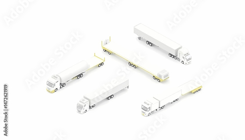 An isometric view featuring several types of semi-trucks and trailers, all in clean white.