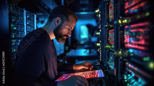 An IT technician is setting up a complex supercomputer system using a digital tablet beside a server cabinet