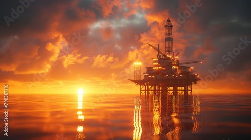 An ocean drilling platform bathed in orange dusk light, set in a still sea.