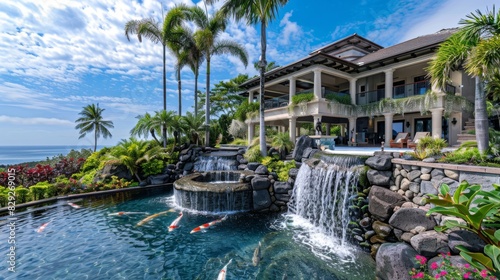An oceanfront villa with a cascading waterfall and koi pond in the landscaped gardens