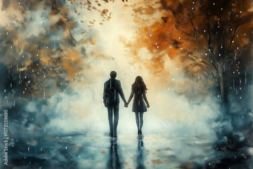 An oil painting of a couple holding hands in the rain, walking through a misty autumn forest with warm orange and cool blue tones, creating a romantic and serene atmosphere