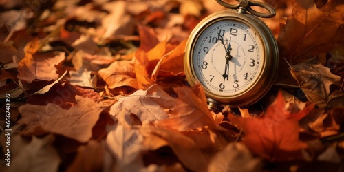 An Old Clock Nestled Amidst Autumn Leaves, Symbolizing the Annual Time Change between Summer and Winter