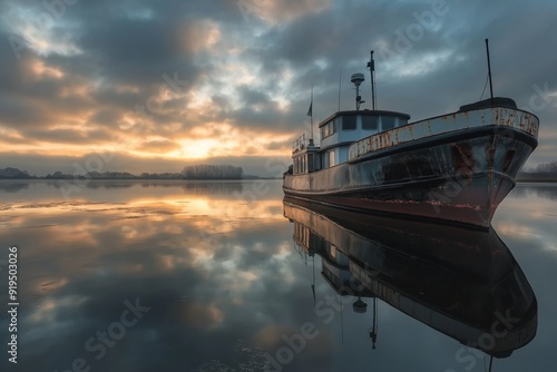 An old rusty boat is docked on calm water during a tranquil sunset, creating a serene and reflective scene, symbolizing peace.