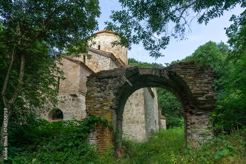 An old stone church with a tiled roof and a dome in the forest. Brick arch of an old wall. There are trees and bushes around. Day, bright blue sky.