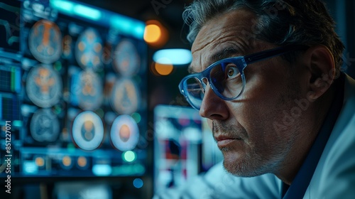 An older man with glasses and a thoughtful expression monitors multiple glowing screens in a dimly lit control room.