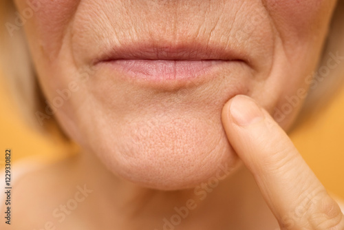 An older woman is softly touching her chin with her finger, showing a thoughtful expression. The warm background enhances the intimate moment, suggesting contemplation or memory