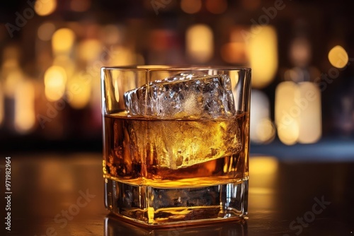 An old-fashioned glass with a large ice cube, glowing amber in the soft light of a dark, atmospheric bar, old fashioned, elegant cocktail