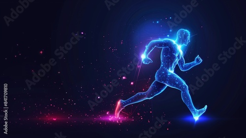 an Olympic athlete running silhouette with illuminated lines and dots on a dark background, futuristic digital business template background