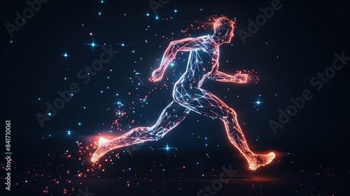 an Olympic athlete running silhouette with illuminated lines and dots on a dark background, futuristic digital business template background