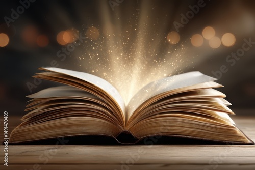 An open Bible illuminated by rays of light, showing pages and cover of the book.
