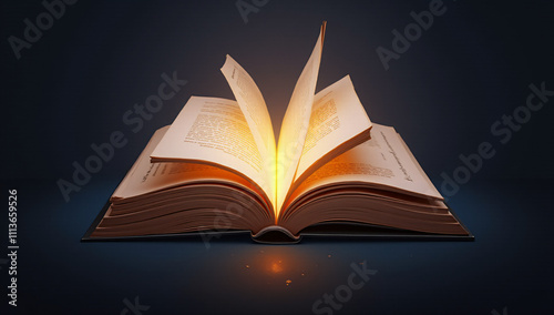 An open book emits a warm golden glow, symbolizing knowledge, wisdom, and the magic of storytelling against a dark background.