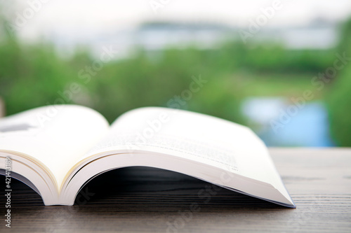 An open book in front of the window
