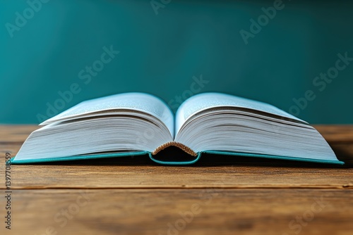 An open book, pages fanned, rests on a wooden surface against a teal backdrop