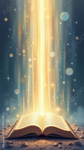 An open book radiating light with an ethereal scene, suggesting a journey or exploration of faith and spirituality.