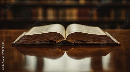 An open book resting on a glossy wooden table, its reflection creating a mirror-like effect.