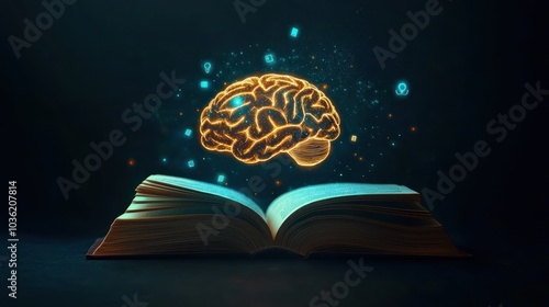 An open book with a glowing brain above, symbolizing knowledge and intelligence.
