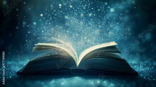 An open book with pages turning, glowing light particles emanating from the text on each page against an abstract blue background