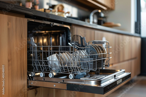An open dishwasher filled with dishes in a modern kitchen