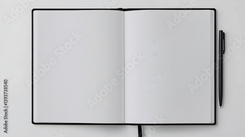an open notebook with blank pages and a pen, ready for writing or drawing
