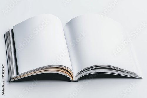 An open softcover book with blank white pages, displayed in a clean, minimalistic setting, perfect for showcasing editorial content or design layouts