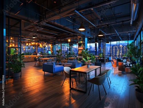An open-plan office with collaborative workspaces, vibrant green plants, cozy seating areas, and a relaxed, creative atmosphere, illuminated by soft, warm lighting