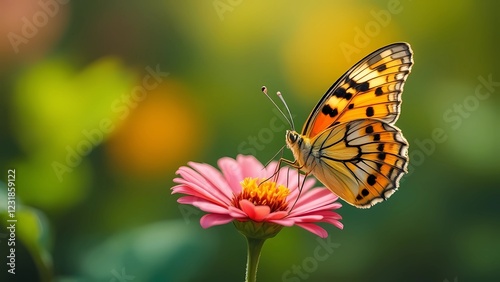 An Orange Butterfly Gracefully Lands on a Radiant Pink Flower, With a Soft, Blurred Background Enhancing the Scene