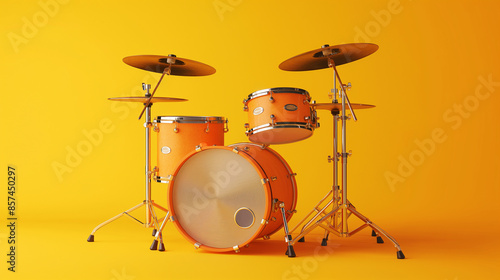 An orange drum set in a minimalist yellow room with shadows.