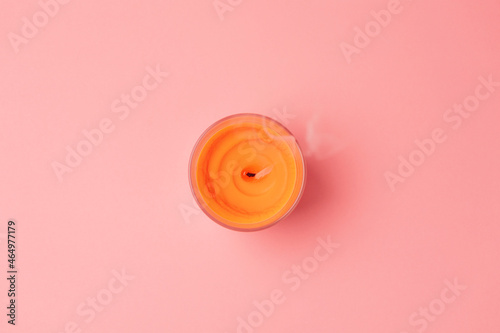 An orange extinguished candle on a pink background. Flat lay. Copy space. The concept of psychological burnout